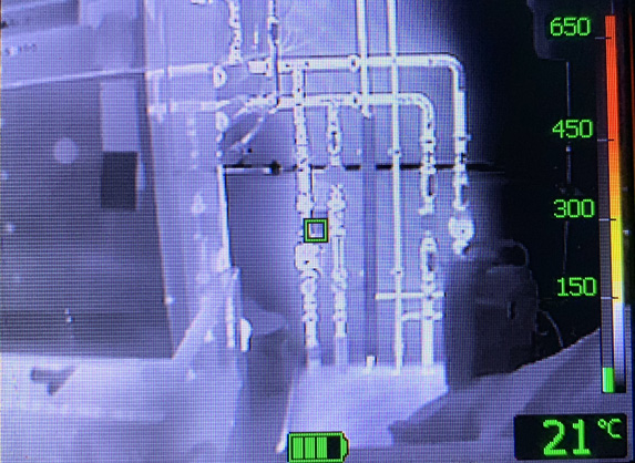 Das folgende Bild zeigt die Heizungsrohre der Heizung in unserem Feuerwehrhaus. Die Umgebung (Messpunkt in der Mitte) liegt bei ca. 21°C, die wasserführenden Rohre können als solche erkannt werden, da diese deutlich wärmer sind. Wie zu erkennen ist, handelt es sich dabei um ein grobes Bild. Details lassen sich nicht erkennen.